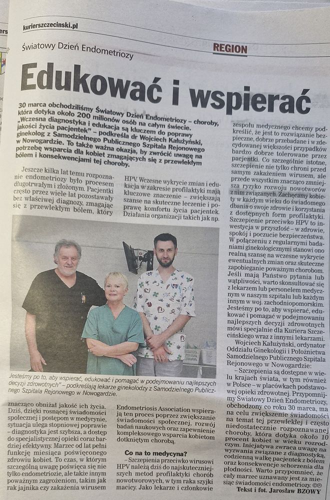 W wydaniu z 2 kwietnia 2026 r. ukazał się wywiad pt. „Edukować i wspierać” z dr. n. med. Wojciechem Kałużyńskim, ordynatorem Oddziału Ginekologiczno-Położniczego SPSR w Nowogardzie. Rozmowa dotyczy m.in. profilaktyki zdrowia kobiet, nowoczesnej diagnostyki oraz problemu endometriozy – w kontekście Światowego Dnia Endometriozy obchodzonego 30 marca. Zachęcamy do przeczytania całego artykułu.