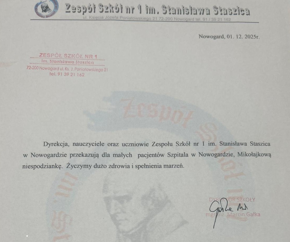 - Serdecznie dziękuję w imieniu własnym oraz personelu Samodzielnego Publicznego Szpitala Rejonowego w Nowogardzie uczniom i uczennicom oraz dyrektorowi Zespołu Szkół nr 1 im. Stanisława Staszica, panu Marcinowi Gałce, za piękny gest i zaangażowanie. Wasza kolejna inicjatywa i otwartość na potrzeby najmłodszych są dla nas ogromnym wsparciem. To dzięki takim inicjatywom możemy wspólnie budować atmosferę, która wspiera zdrowienie dzieci.